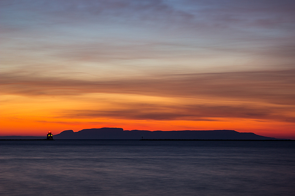 The photograph captures the serene beauty of a sunrise over Lake Superior in Thunder Bay, with the iconic Sleeping Giant formation in the distance.... more
